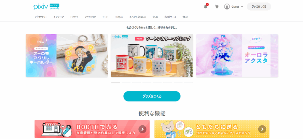pixivFACTORY(ピクシブファクトリー)は、イラスト・マンガ・小説の投稿プラットフォーム「pixiv」が運営する、クリエイター向けのオンデマンドグッズ制作&販売サービスです。イラストや写真をアップロードするだけで、アクリルスタンド、Tシャツ、スマホケース、タオル、缶バッジなど80種類以上のオリジナルグッズが1個から簡単に作成可能。デザインツールも充実しており、初心者でも安心です。