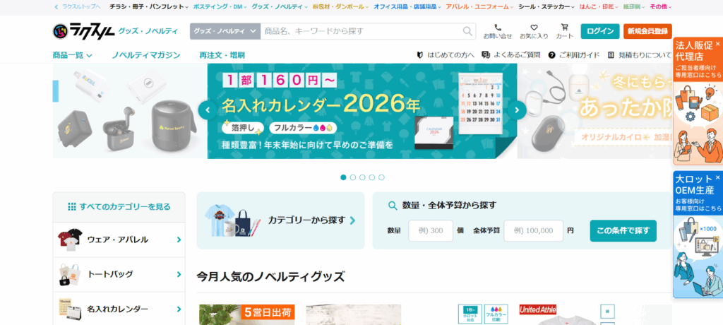 ラクスルのグッズノベルティ専門サイトは、企業や団体向けにオリジナルグッズ・記念品の制作サービスを提供しています。文房具、カレンダー、Tシャツ、タオル、マグカップなど幅広い商品を取り扱い、名入れにも対応しています。