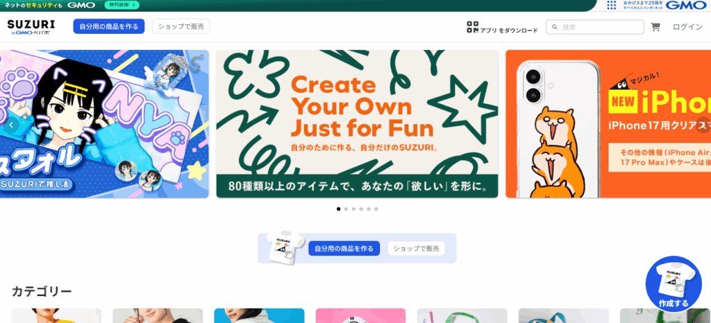 SUZURI(スズリ)は、GMOペパボ株式会社が運営するオリジナルグッズの作成・販売ができるオンラインプラットフォームです。イラストや写真などの画像をアップロードするだけで、Tシャツ・スマホケース・トートバッグ・マグカップなど80種類以上のアイテムを自動生成し、販売可能になります。