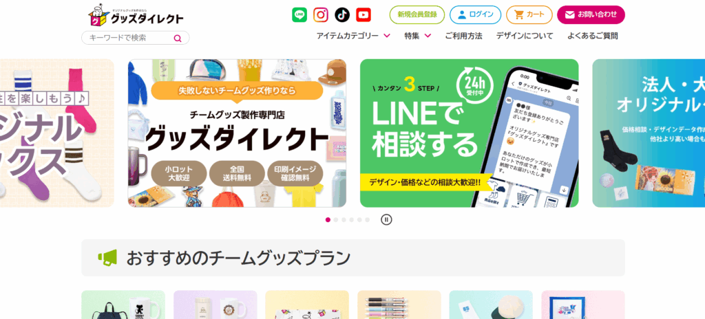 グッズダイレクトは、チームやサークル、団体向けのオリジナルグッズ制作を専門とするオンラインショップです。応援グッズやユニフォーム、記念品、イベント用グッズなど、チームの一体感を高めるアイテムを最小1個から全国送料無料で注文できます。