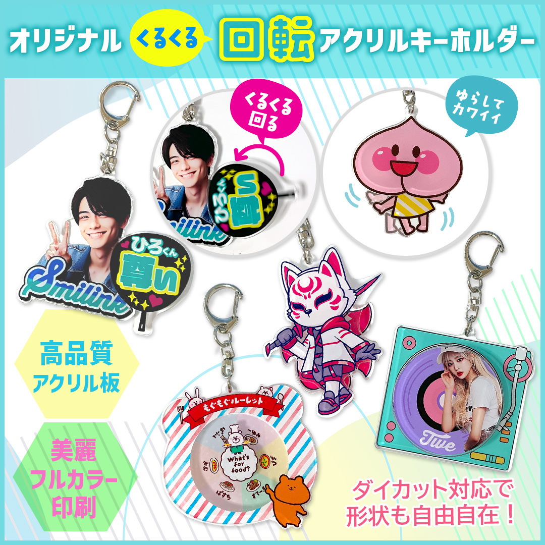 形状は自由自在&高品質プリントで美しい仕上がりのオリジナル くるくる回転アクキーです
