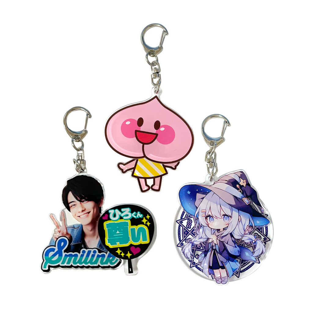 例えば、「うちわが動く推し活キーホルダー」や「身体がゆらゆら揺れるキャラクターキーホルダー」など、アイデア次第で様々な表現のオリジナル アクリルキーホルダーを制作することができます。