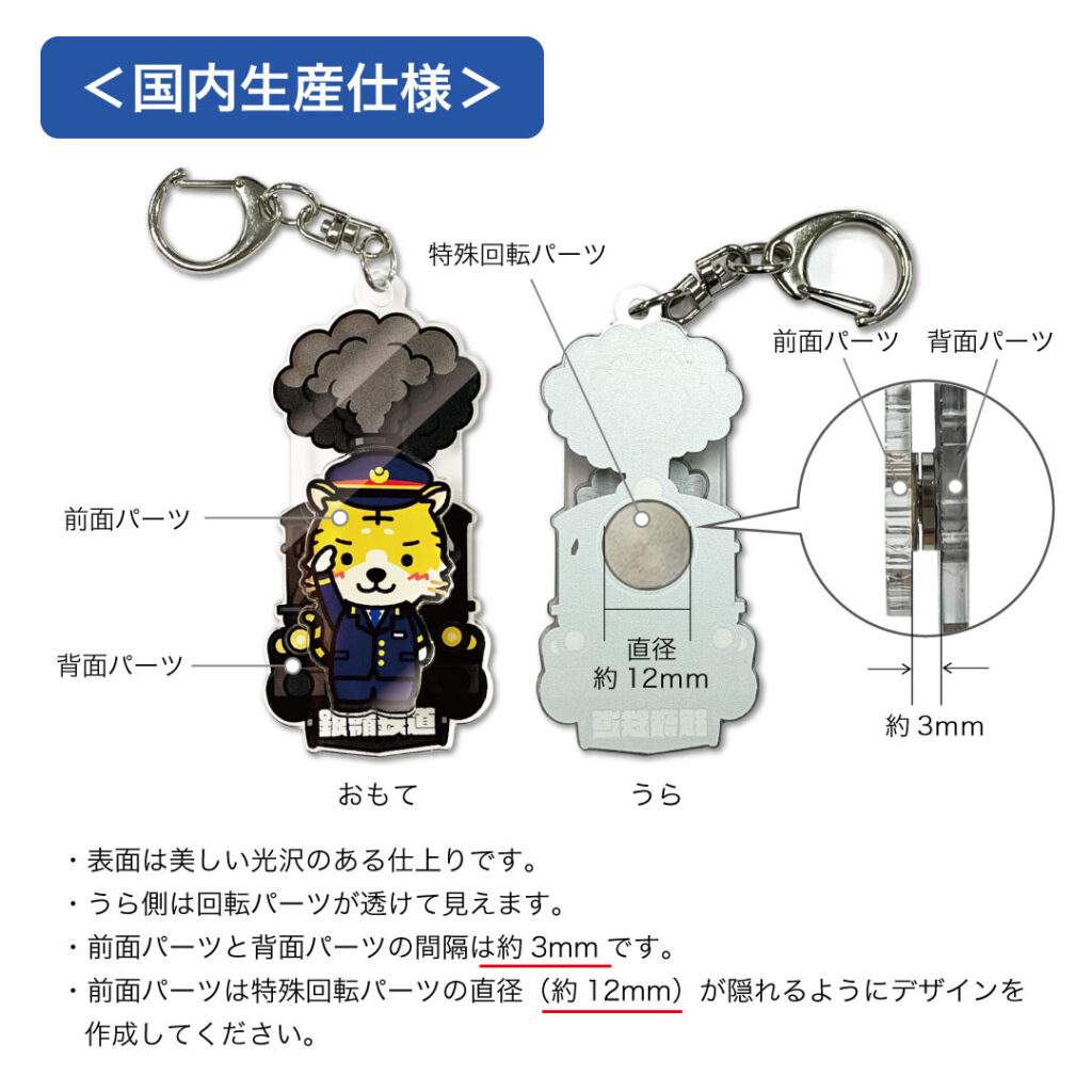 国内生産仕様の「くるくる回転アクリルキーホルダー」は、アクリルの裏側から印刷を行うことによる、ガラスのような美しい光沢と立体感が魅力。