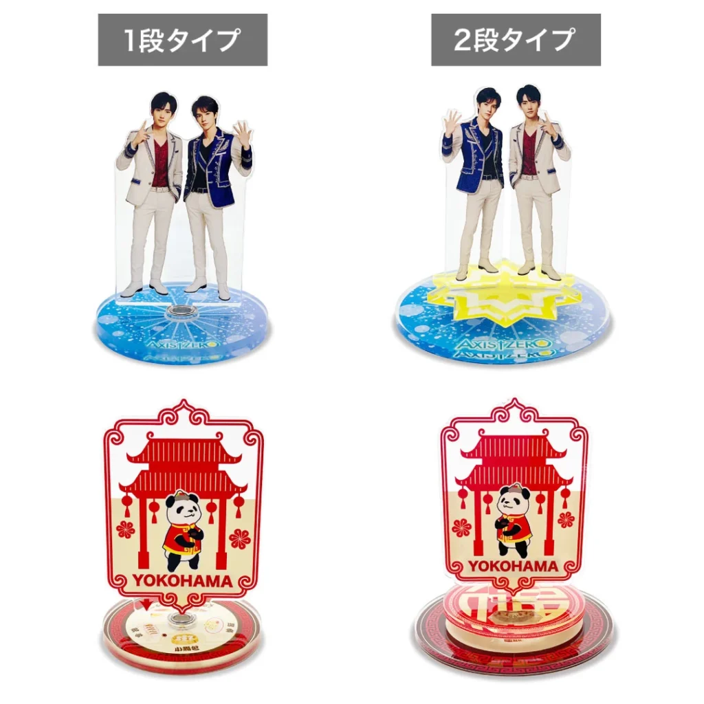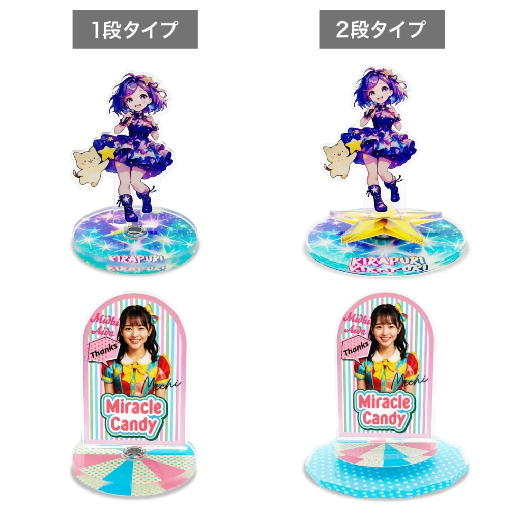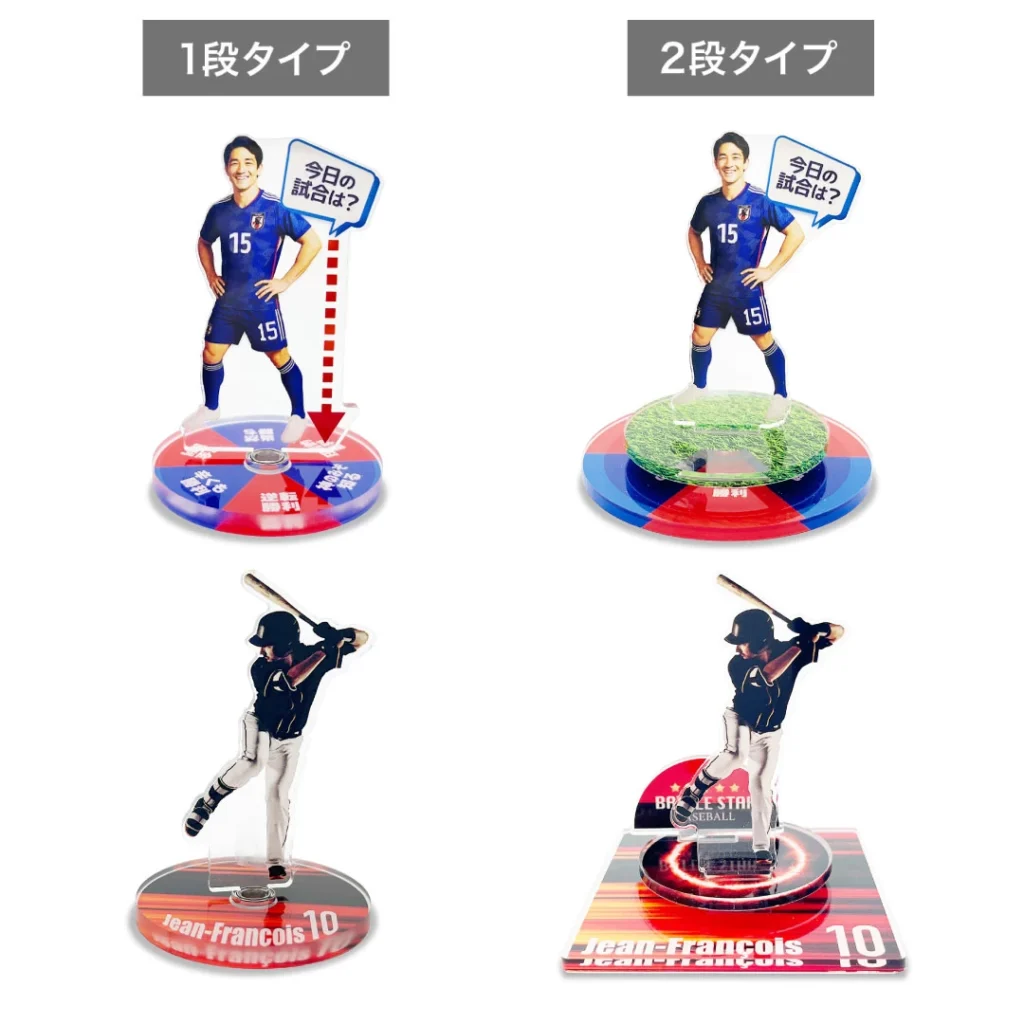 一方、2段タイプは、回転パーツ付き土台+中間台座+アクスタの3層構造で、すべてダイカット対応。自由度が高く、立体感や世界観を重視したデザイン表現が可能です。