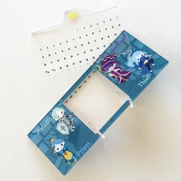 オリジナルアクリルカレンダーは、フルカラーインクジェット印刷による高精細で鮮やかな仕上がりが特長です。透明感のあるクリアアクリル素材を使用することで、美しく洗練されたデザインが可能になり、アニメグッズやブランドノベルティとしても映えるオリジナルアイテムを制作できます。