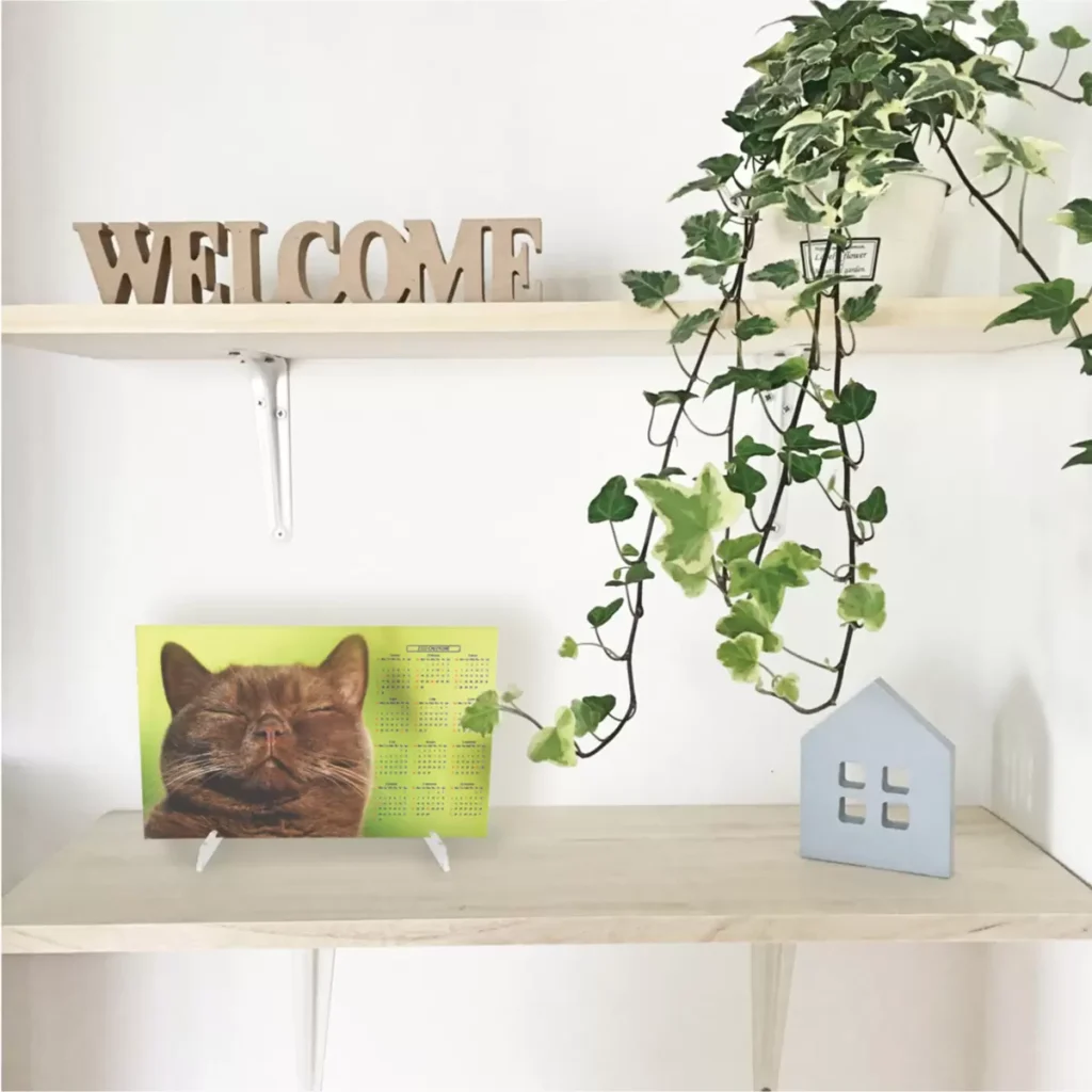 スタンド付きなのでデスクや棚に置くだけでおしゃれなインテリアに。カレンダーとしてだけでなく、部屋のワンポイントになるデザインが気に入っています。水回りでも使えるのでキッチンでも活躍しています。