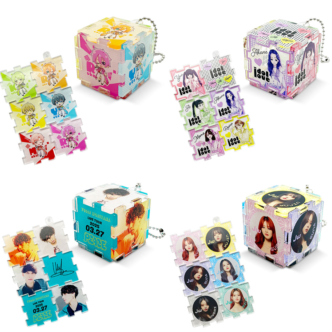 アニメ作品の複数キャラクターや、アイドルグループ・スポーツチームのメンバーを各パネルにデザインしたり、一人のアーティストの異なる表情や衣装、シーンを各面に配置することで、ファンにとってたまらないコレクション性の高いグッズに仕上がります。