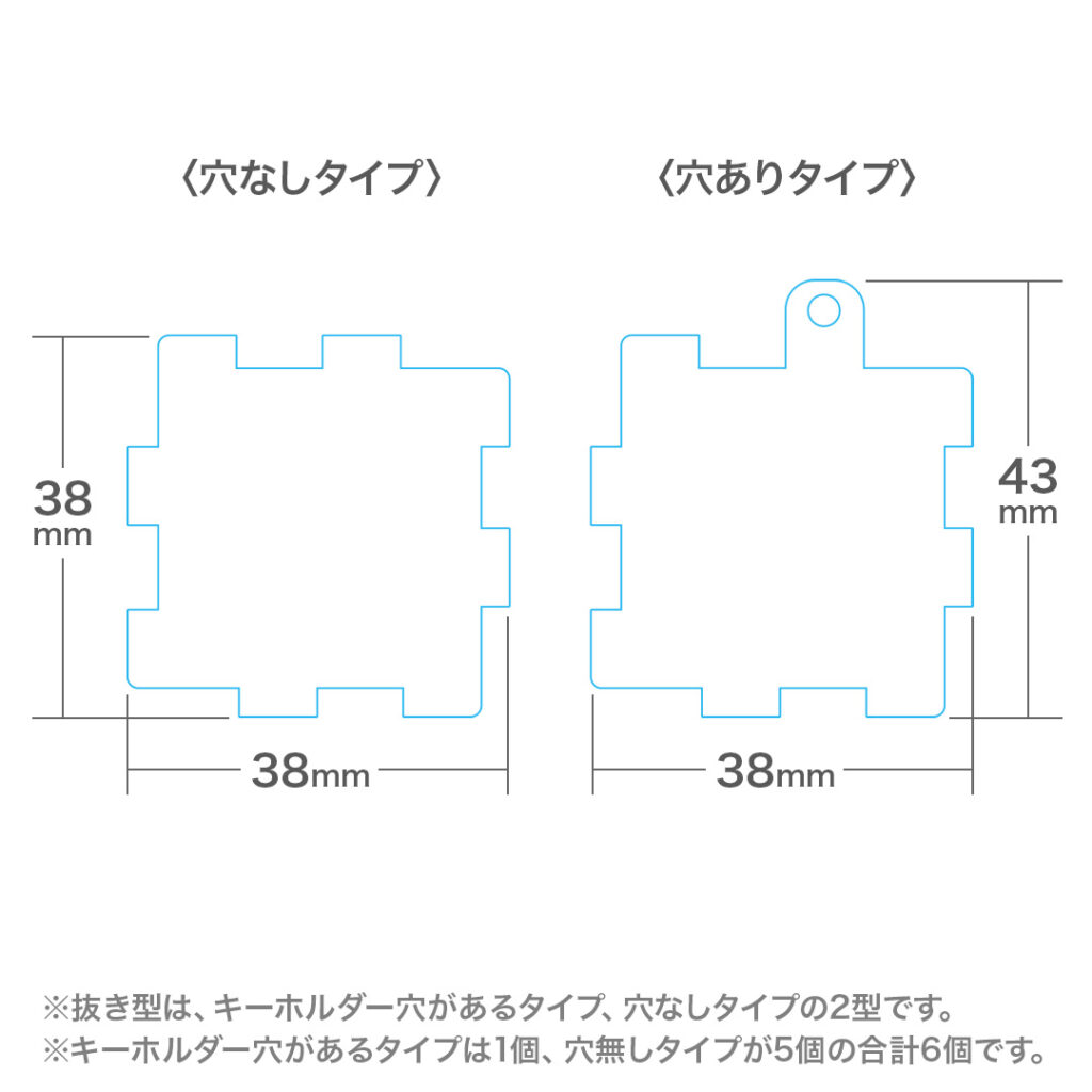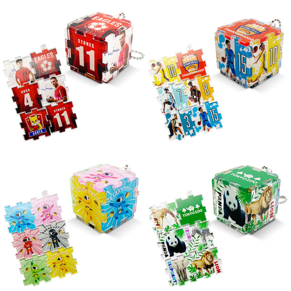 パズル形状の6枚のアクリルパネルを互いにはめ込むことで立方体を構成しますので、パネルの配置は自由に組み替えることが可能です。また、透明度の高い高品質アクリルに、高精細プリンターで印刷を施すので繊細なデザインも鮮明に再現できます。従来のアクリルキーホルダーに比べて存在感があり、非常に目を引くアイテムです。