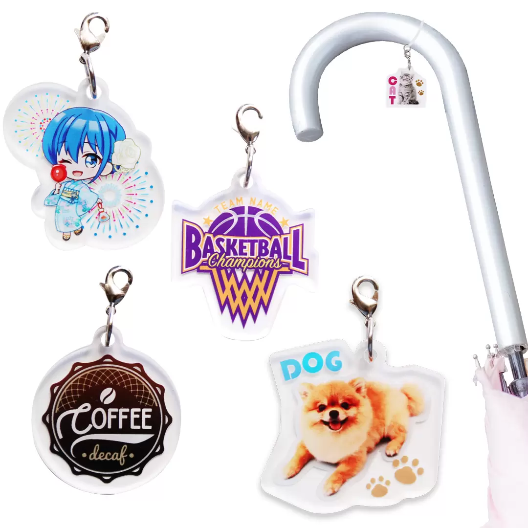こちらの「オリジナル アンブレラマーカー」は、UVインクジェット印刷によるフルカラー表現が可能なアクリル製ダイカットグッズで、お客様の自由な形状・デザインで完全オリジナル制作が可能です。傘の柄に装着する「Oリングタイプ」またはつゆ先に取り付ける「8の字リングタイプ」の2種のシリコンパーツを用い、どちらも伸縮性に富み着脱が簡単で、傘の目印として取り違えや盗難リスクを軽減するほか、アクセサリー感覚でファッション性も兼ね備えています。 また、傘以外にもペットボトルマーカー、ペンライトチャーム、チャーム単体で根付ストラップやカニカンつきアクリルチャームに応用することができ、ファンイベント・コンサート・同人活動・企業ノベルティ・お土産など幅広いシーンにマッチするのが特長です。 サイズは40mm角以内、100個から小ロット対応で、価格は100~299個264円/300~499個176円/500~999個168円/1,000個以上160円(いずれも税別・印刷・加工費込み、複雑カットは別途見積)で、校正サンプルは最短3営業日、量産は約12営業日の国内生産体制。 OPP袋個包装納品に加え、希望によりガチャ用カプセル納品も可能。傘立てやイベント会場で“推し”を目立たせるアイテムとして、誰にでも使いやすく老若男女問わず楽しめる実用性とデザイン性を兼ね備えたグッズです。