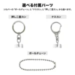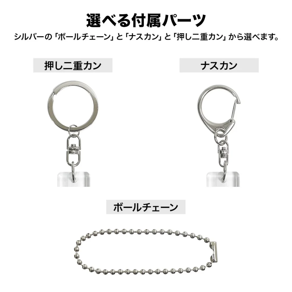 キーホルダーパーツは「ボールチェーン(シルバー)」「ナスカン」「押し二重カン」の3種類を標準でご用意。用途やデザインに合わせてお選びいただけます。アクリル素材は水に強く耐久性にも優れているため、日常的に使用しても色褪せや劣化がしにくく、長く愛用できます。