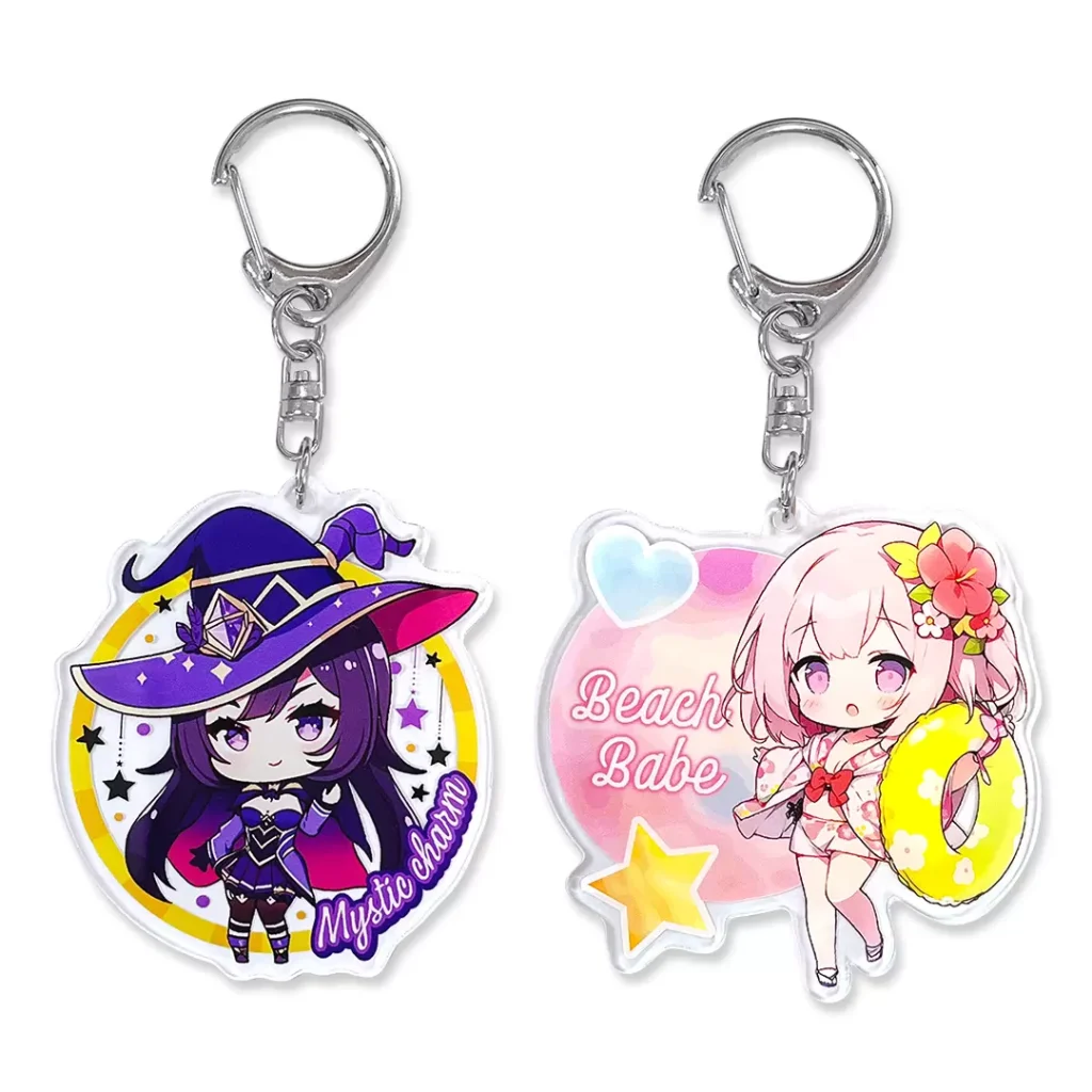 お客様にはデザインデータをご入稿いただくだけで、販売や配布が可能な状態に仕上げてお届けします。小ロットからの制作にも対応しているため、イベント限定グッズや試作品、ノベルティ制作にも最適です。アニメ・漫画・ゲーム・同人イベントのキャラクターグッズから、アーティストやアイドルのライブ物販、企業の販促品や観光地のお土産まで、幅広いシーンで活躍する高品質なアクリルキーホルダーを、ぜひオリジナルデザインでお作りください。