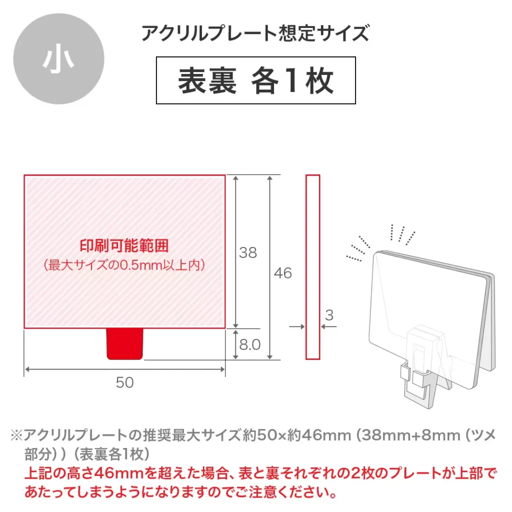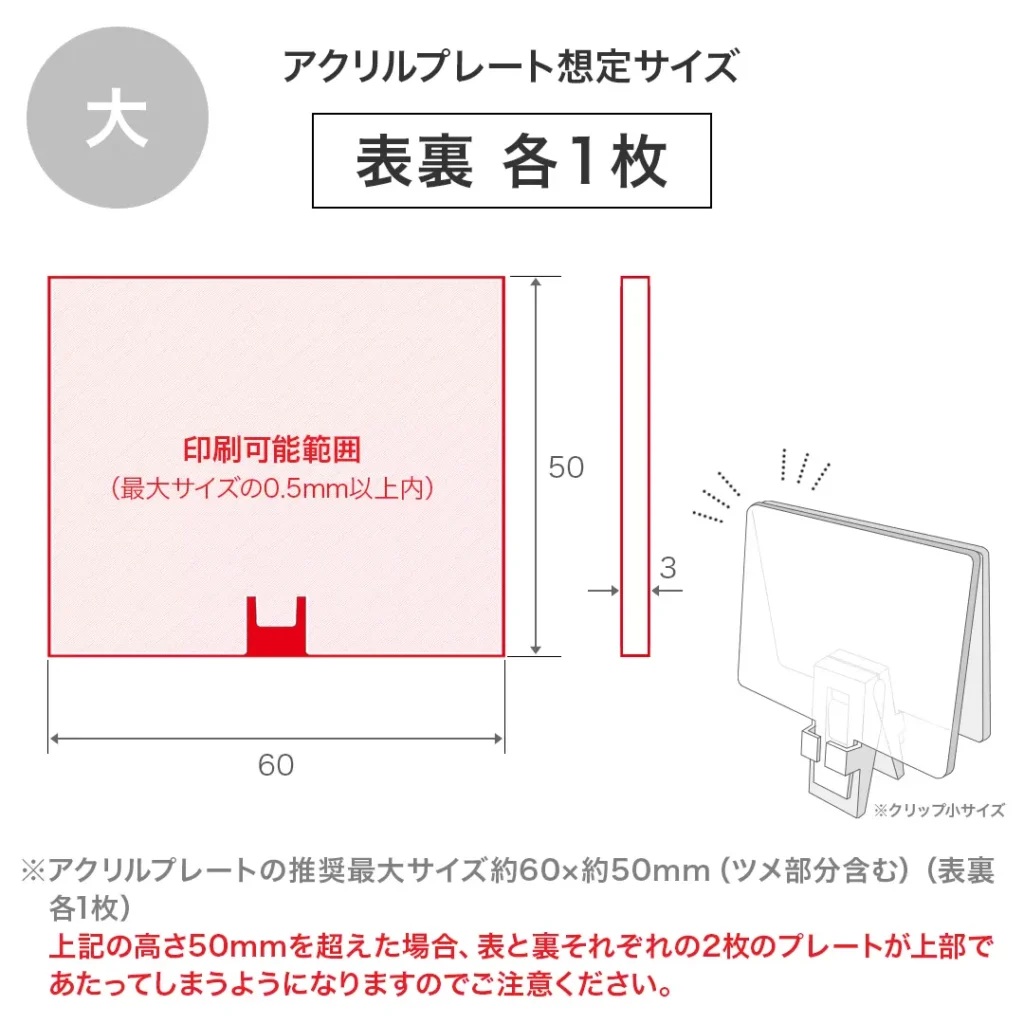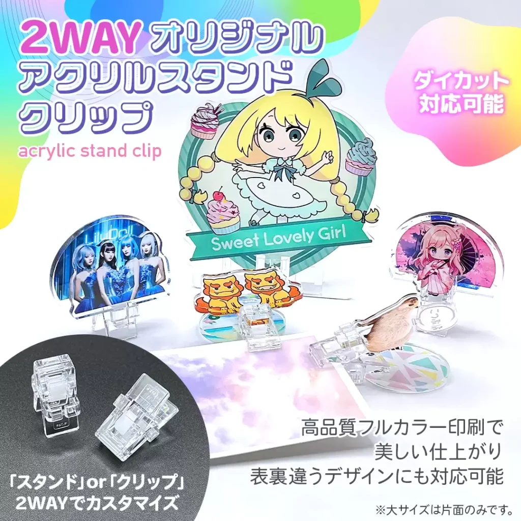 オリジナル アクリルスタンドクリップは、アクリルスタンドとアクリルクリップの2WAY仕様で使える便利なアイテムです。アクリルプレートの差し込み方向を変えるだけで、スタンドとして飾ったり、クリップとして日常使いしたりと、用途に合わせて自由に切り替えが可能です。大サイズは大型のアクリルプレートを1枚、小サイズは前後に1枚ずつセットでき、特に小サイズは前後を別デザインにすることで立体感や奥行きのある仕上がりが楽しめます。