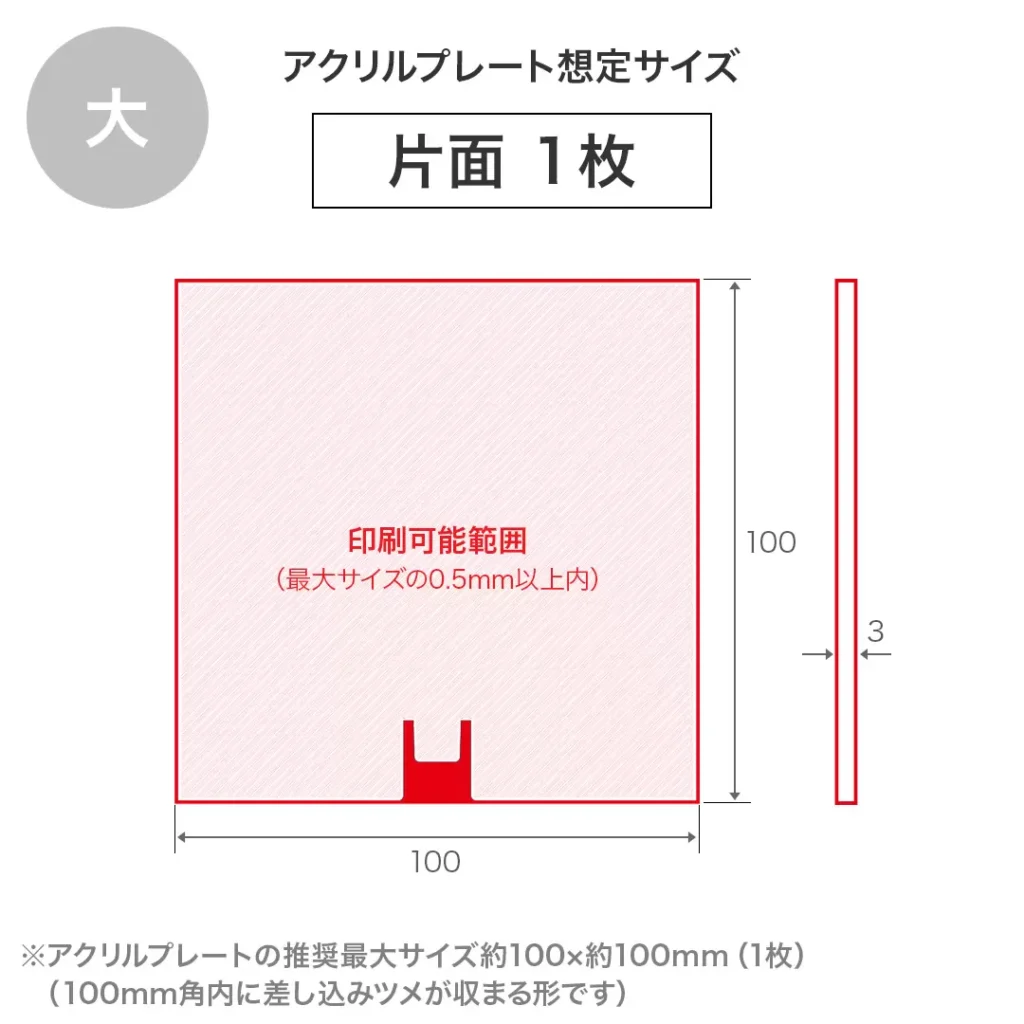 アクリルプレートはダイカット加工対応で、キャラクターのシルエットやロゴなどデザインに合わせた自由な形状で制作可能です。クリップパーツは大サイズと小サイズの2種類を用意。大サイズは大型プレートを1枚、小サイズは前後に1枚ずつ、合計2枚のプレートをセットできます。小サイズでは前面と背面で異なるデザインが可能で、例えば前側に推しキャラクター、後ろ側に背景ビジュアルを配置すれば、立体感のある仕上がりを実現できます。