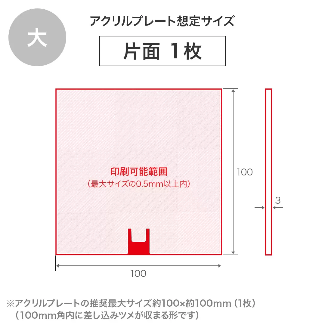 オリジナル アクリルスタンドクリップは、自由な形状・サイズで制作いただけるオリジナルグッズですが、アクリルスタンドパーツの制作いただける目安のサイズが「大」「小」それぞれに設けられております。小サイズクリップは、前後差込タイプの場合はアクリルスタンドパーツが大きすぎると、スタンドとして使用する際に上部で前後のパーツ同士がぶつかってしまうため、また大サイズはあまりパーツが大きすぎてしまうとバランスが取れず倒れてしまうためです。