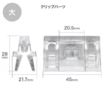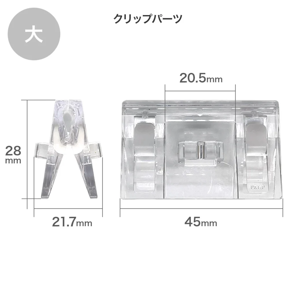 クリップ本体:PC(ポリカーボネイト) クリップバネ:POM(ポリアセタール) プレート:アクリル(3mm厚) 納期