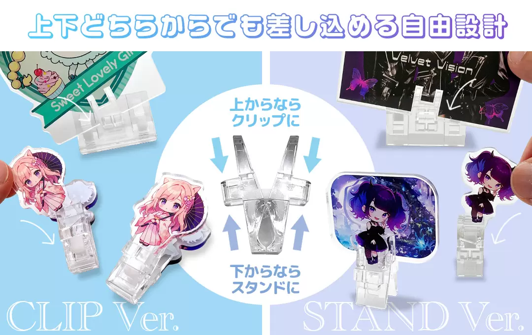 アニメイベントやコミケ、同人サークルの販売アイテムとしても人気が高い理由は、この実用性とデザイン性の両立にあります。購入者は自宅や職場でスタンドとして飾ったり、クリップとしてメモや写真を挟んだりと、さまざまなシーンで使えます。さらに、ライブ会場やサークルスペースではプライスカードスタンドや小物ディスプレイとしても活用でき、販売アイテムと展示ツールの両方の役割を果たします。