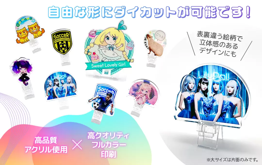 高品質なオリジナル アクリルスタンド(アクスタ)を、お客様のデザインで自由に制作していただけます。使用するのは透明度の高いアクリル素材。キャラクターやイラスト、写真などをフルカラーで高精細に印刷し、鮮やかで美しい仕上がりを実現します。印刷後にはダイカット加工を行い、自由な形にカットできるため、キャラクターの全身姿をそのまま立体的に再現したり、オリジナルのシルエットを生かした個性的なデザインに仕上げたりすることが可能です。 台座部分にもデザインをプリントできるのも大きな特長です。キャラクター名やグループロゴ、イベント名、サークル名などを入れることで、グッズ全体に統一感を持たせたり、推し活に欠かせない「推しだけのアイテム」を演出することができます。ライブグッズやコンサート、アニメイベント、同人サークルでの販売など、幅広いシーンで活躍するオリジナルグッズとしてご利用いただけます。 また、小型サイズのアクリルスタンドも制作可能です。カプセルトイの景品やコレクションアイテムとしても人気で、ファンが気軽に集めたくなる商品に仕上げられます。 販売に必要な資材も一式揃っておりますので、お客様にはデザインデータをご入稿いただくだけで、完成品としてすぐに販売が可能です。国内生産で、小ロットから大ロットまで柔軟に対応いたしますので、初めての方や少量から試したい方にも安心です。ぜひお気軽にご相談ください。