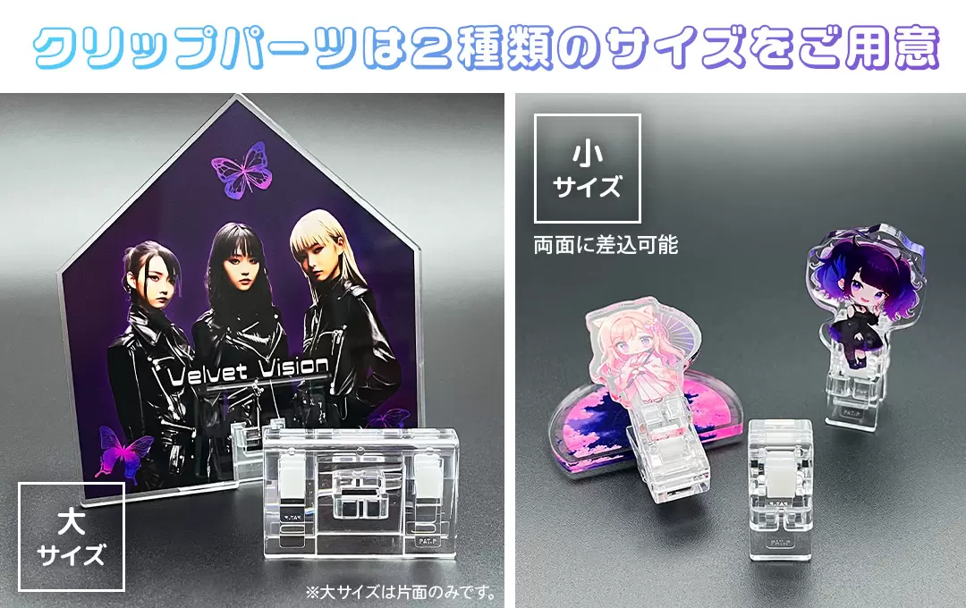 また、クリップパーツは大・小2サイズをご用意。大サイズは店舗のPOPスタンドやメニューボードとしても使える安定感があり、小サイズはコンパクトで携帯しやすく、イベントや外出先での推し活フォトにも最適です。