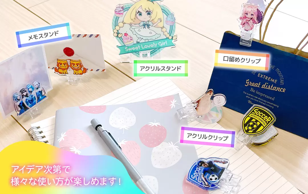 さらに、メモスタンドやプライスカードホルダー、袋の口止めクリップなど、アイデア次第でさまざまな使い方ができるのも魅力。アニメイベントやコミケ、同人サークルの販売グッズとしてはもちろん、店舗や企業のノベルティ、日常の実用品としても活躍します。