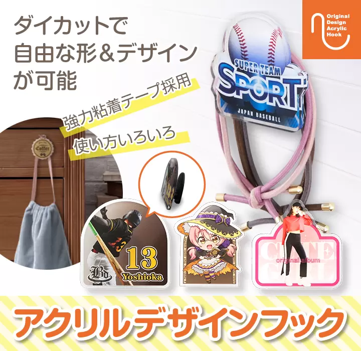 また、アクリル部分はダイカット加工で自由な形にカスタマイズが可能です。お客様のイメージに合わせたデザインで制作できるため、オリジナリティの高いフックを作ることができます。
