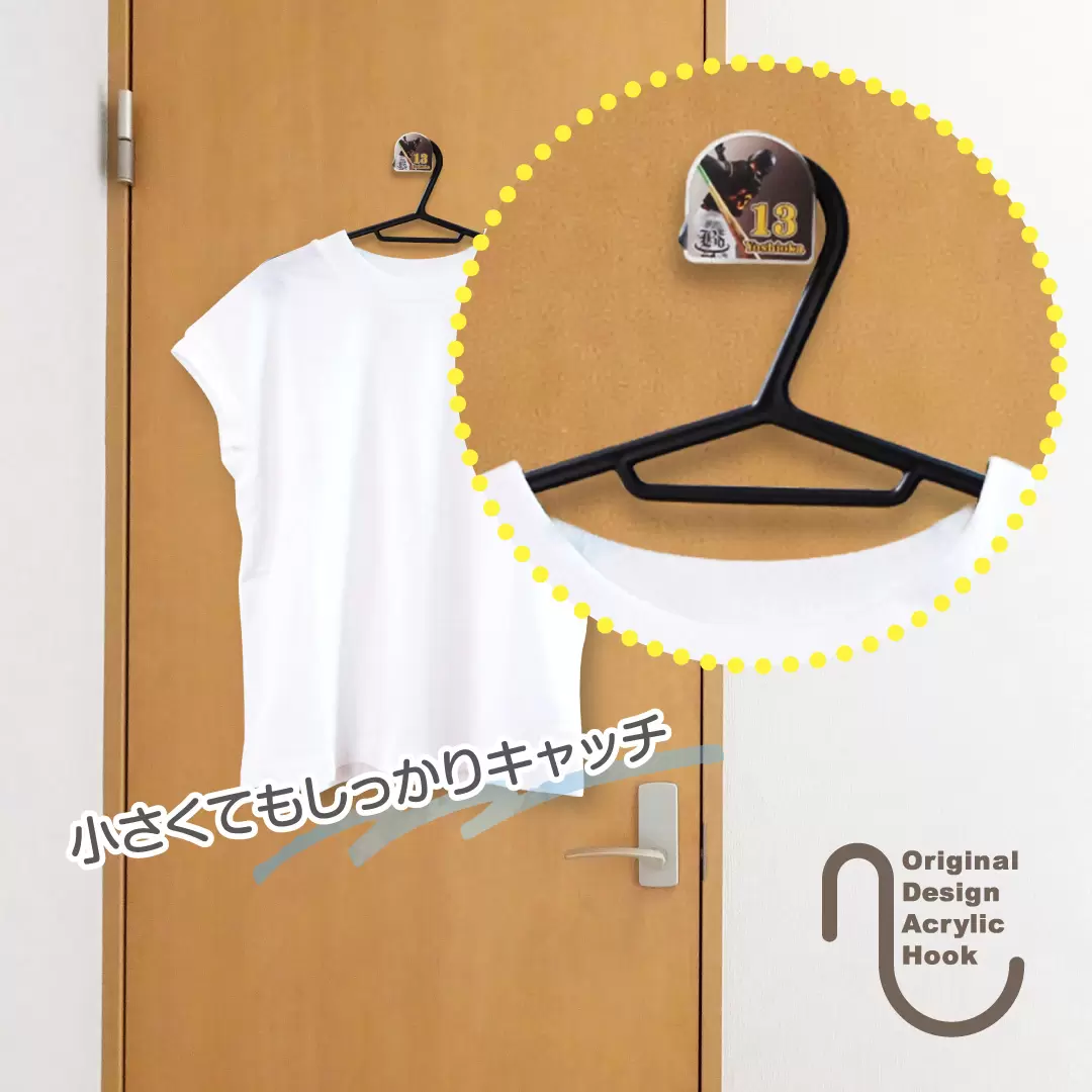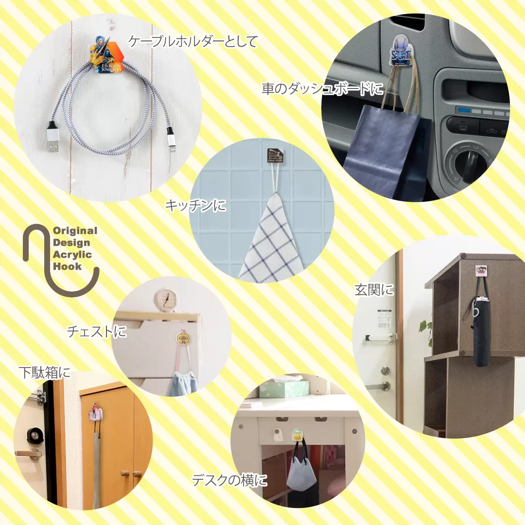 フック本体はブラックとホワイトの2色をご用意しており、アクリルプレートのデザインに合わせて選べるため、全体の統一感を演出できます。小物掛けとしての実用性を備えながら、オリジナルデザインで「飾れる収納アイテム」として楽しめる点も大きな特長です。