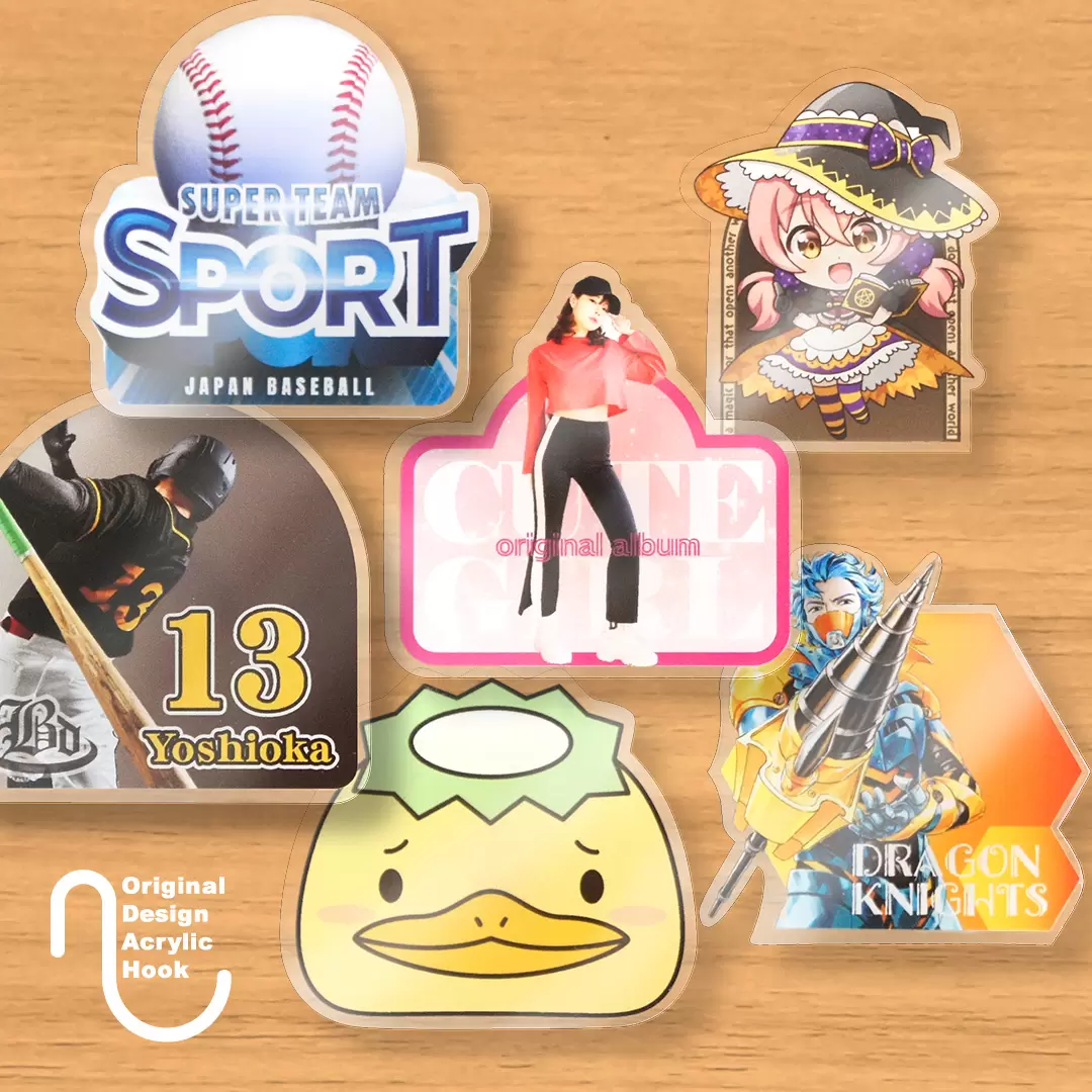 オリジナル アクリルデザインフックは、キャラクターグッズ、アーティストやアイドルのコンサートグッズ、企業や店舗のノベルティなど、多彩な用途に対応できるおすすめのオリジナルアイテムです。