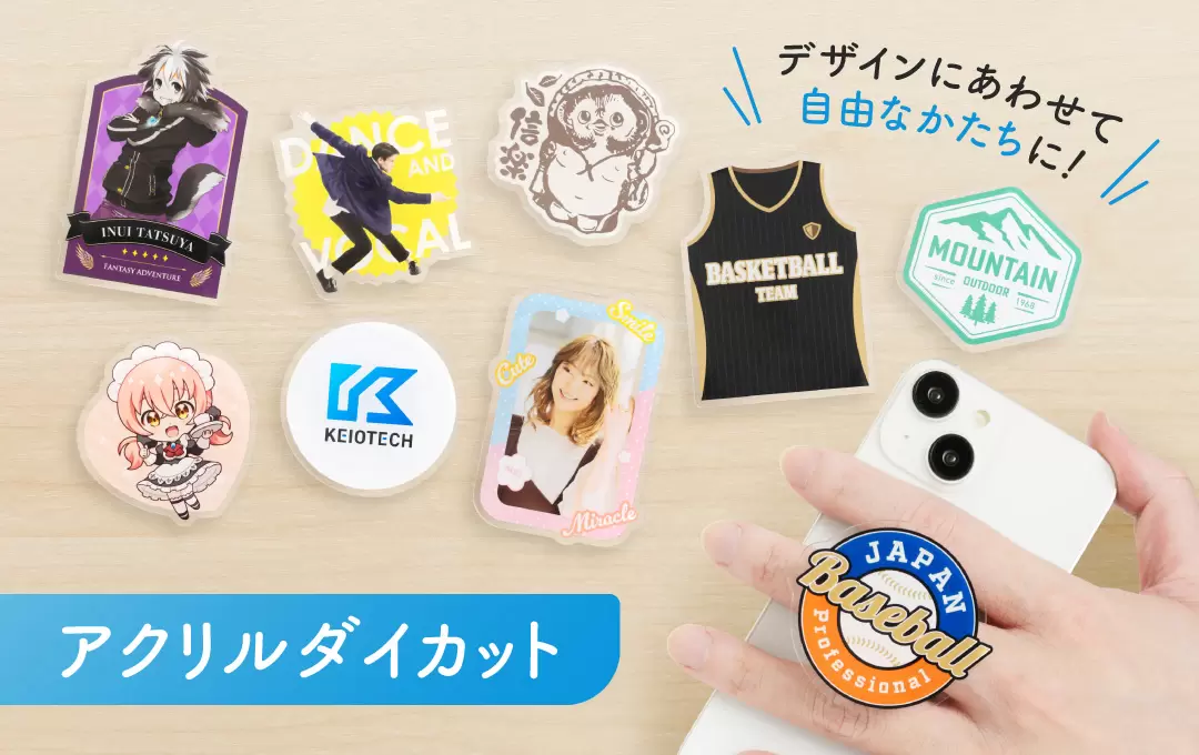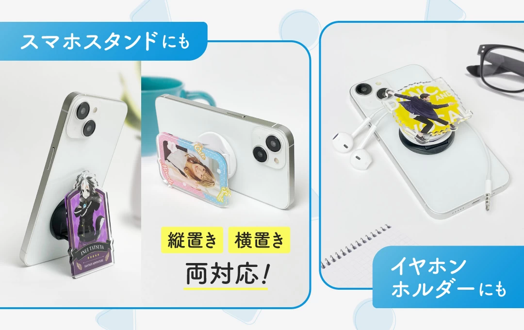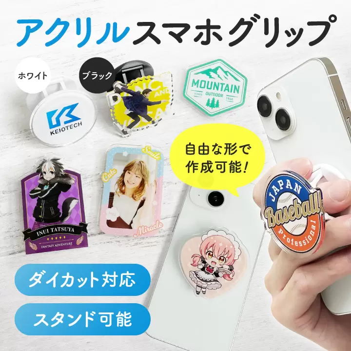 実用性とデザイン性を兼ね備えたオリジナル アクリルスマホグリップは、グッズ制作やノベルティ、ファンアイテムとしてもおすすめのプロダクトです。