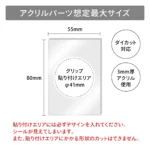 オリジナルアクリルスマホグリップの「アクリルパーツ」部分は、縦:約80mm×幅:約55mmを想定最大サイズとしております。また、スマホグリップ本体を取り付ける、直径:約41mmのグリップ貼り付けエリアが最小必須サイズとなります。この「グリップ貼り付けエリア」より小さいサイズや、「グリップ貼り付けエリア」にかかる形状のカットはできません。