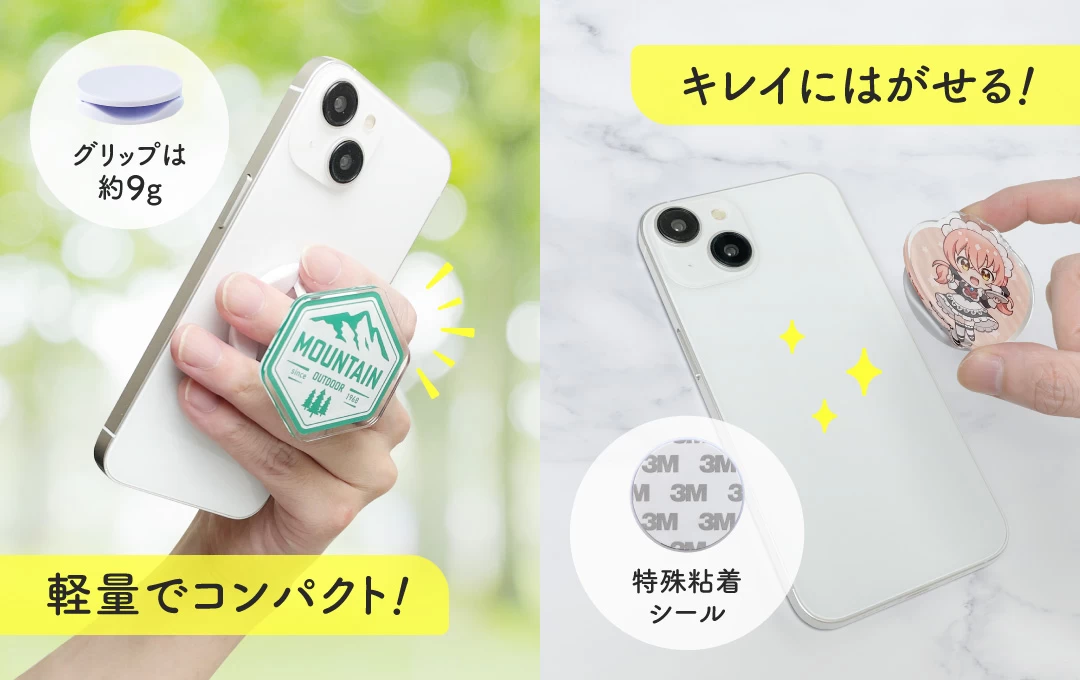 大きな特長は、アクリルダイカットによる自由な形状表現です。キャラクターやロゴ、ブランドのシンボルなどをそのままカットし、完全オリジナルのスマホグリップを製作できます。高品質なアクリル素材を採用しているため、透明感のある美しい仕上がりでデザインを引き立てます。