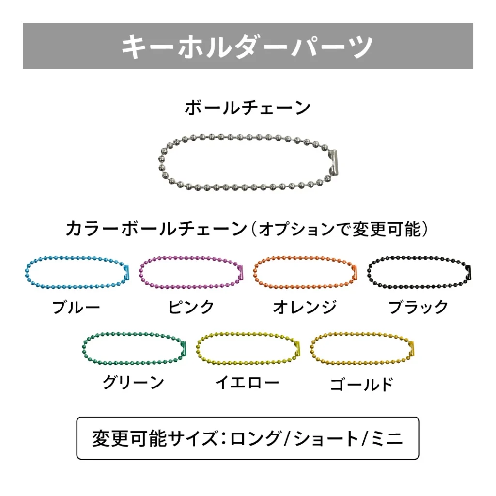 ケイオーのアクリル ルームキーホルダーには、どのサイズにもシルバーのボールチェーンが付属いたします。ボールチェーンは、老若男女使う人を選ばず、また細いチェーンタイプなので小さな金具から太めのハンドルまで、幅広く簡単に通すことができます。スマホケースなどのストラップホールや、ファスナーのスライダーなどにも取り付け可能です。またオプションで、カラーボールチェーン、もしくはカラーワイヤーリングに変更いただくことも可能です。さらにこちらはミニサイズだけのオプションですが、ナスカンタイプ、もしくは二重押しカンタイプのキーホルダーパーツに変更も可能です。
