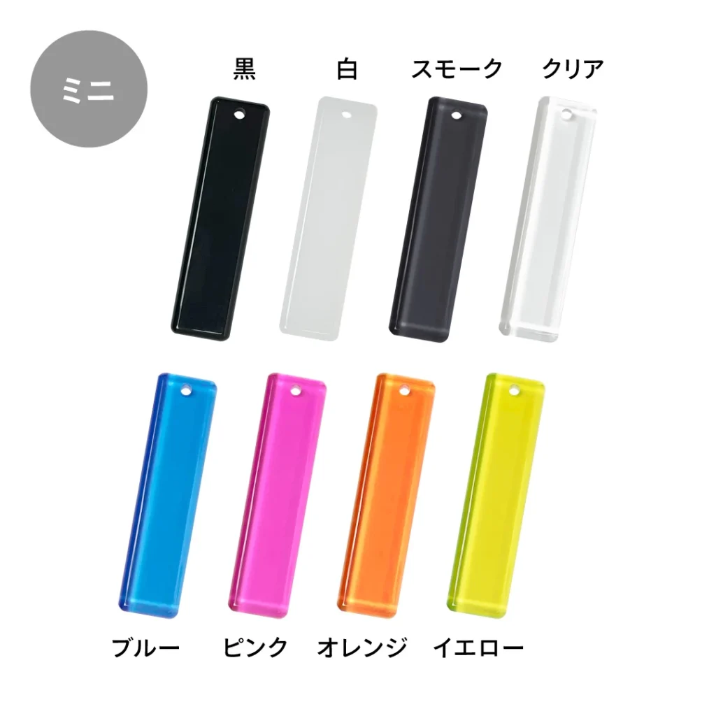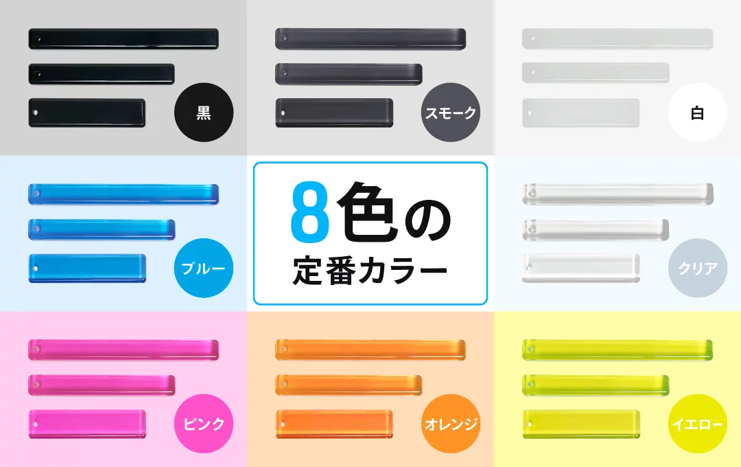本体カラーは、黒・白・スモーク・クリア・ブルー・オレンジ・ピンク・イエローの全8色から選択可能。人気の高い色を厳選しており、デザインやターゲットに合わせた色選びができます。