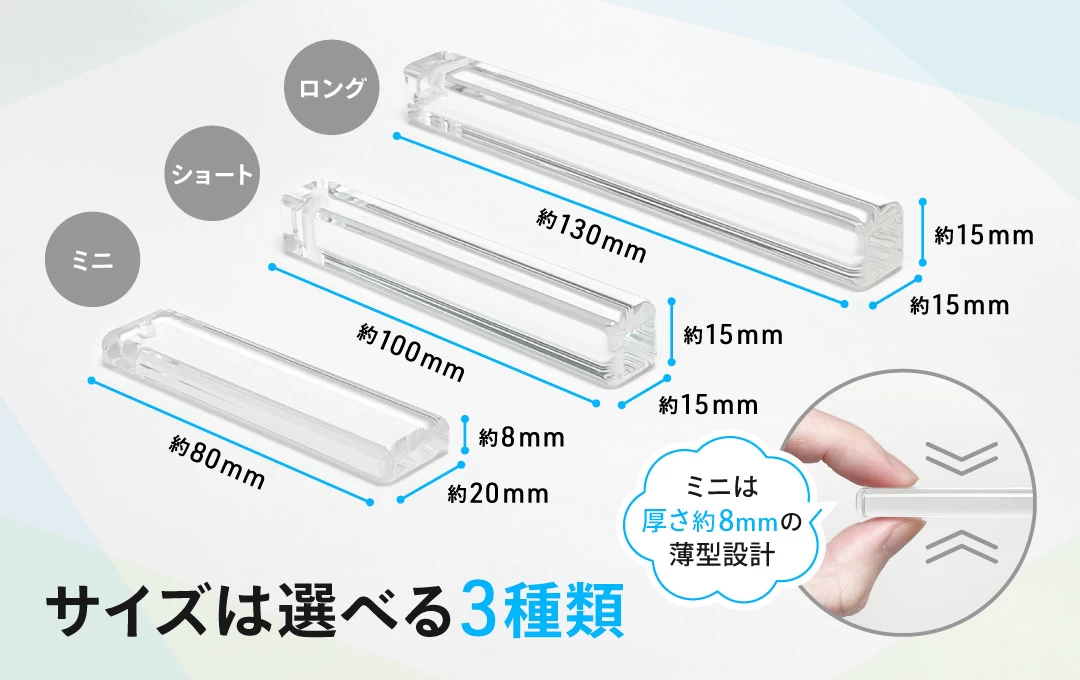 オリジナルアクリルルームキーホルダーは、ロング・ショート・ミニの3種類のサイズ展開で、用途に合わせて選べます。