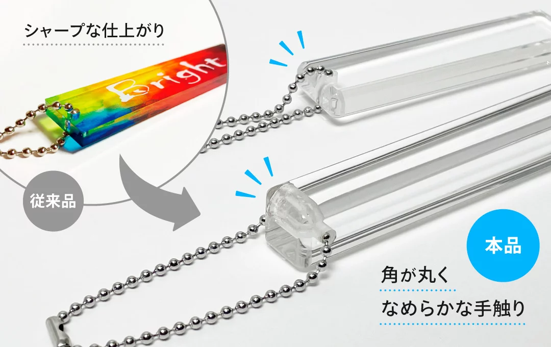 ケイオーのアクリル ルームキーホルダーは、「ロング」「ショート」「ミニ」の3サイズあり、「ロング」と「ショート」は約15mmの角柱形で、「ミニ」のみ厚さ約8mmの短冊形です。いずれも、キーホルダーの角で怪我などがないよう、各コーナーにRを取ってありますので、どこをさわっても滑らかでお子様でも安心してご利用いただけます。ロングサイズは、ホテルキーなどのしっかり手に馴染むタイプでの作成が、またショートサイズは、コミケなどの狭いサークルスペースを圧迫しないグッズとしておすすめです。