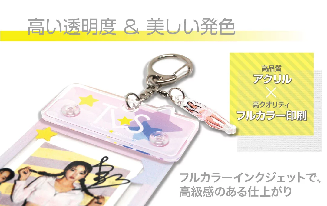 アクリルキーホルダー・アクキー、アクスタなどオリジナルグッズ製作の専門店です。最短3営業日発送してもらえるので、急ぎの発注にもおすすめです。