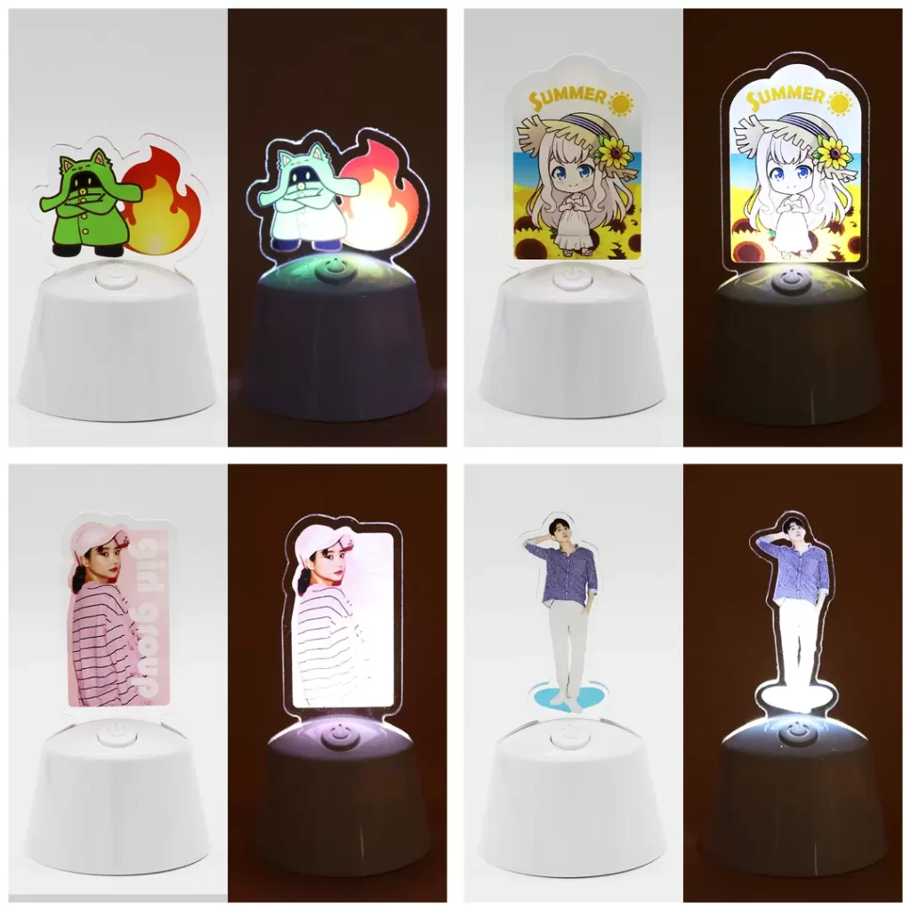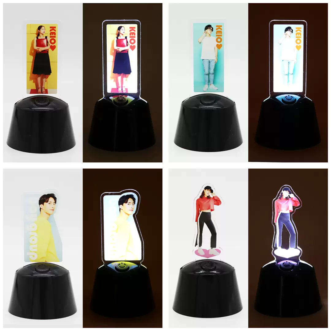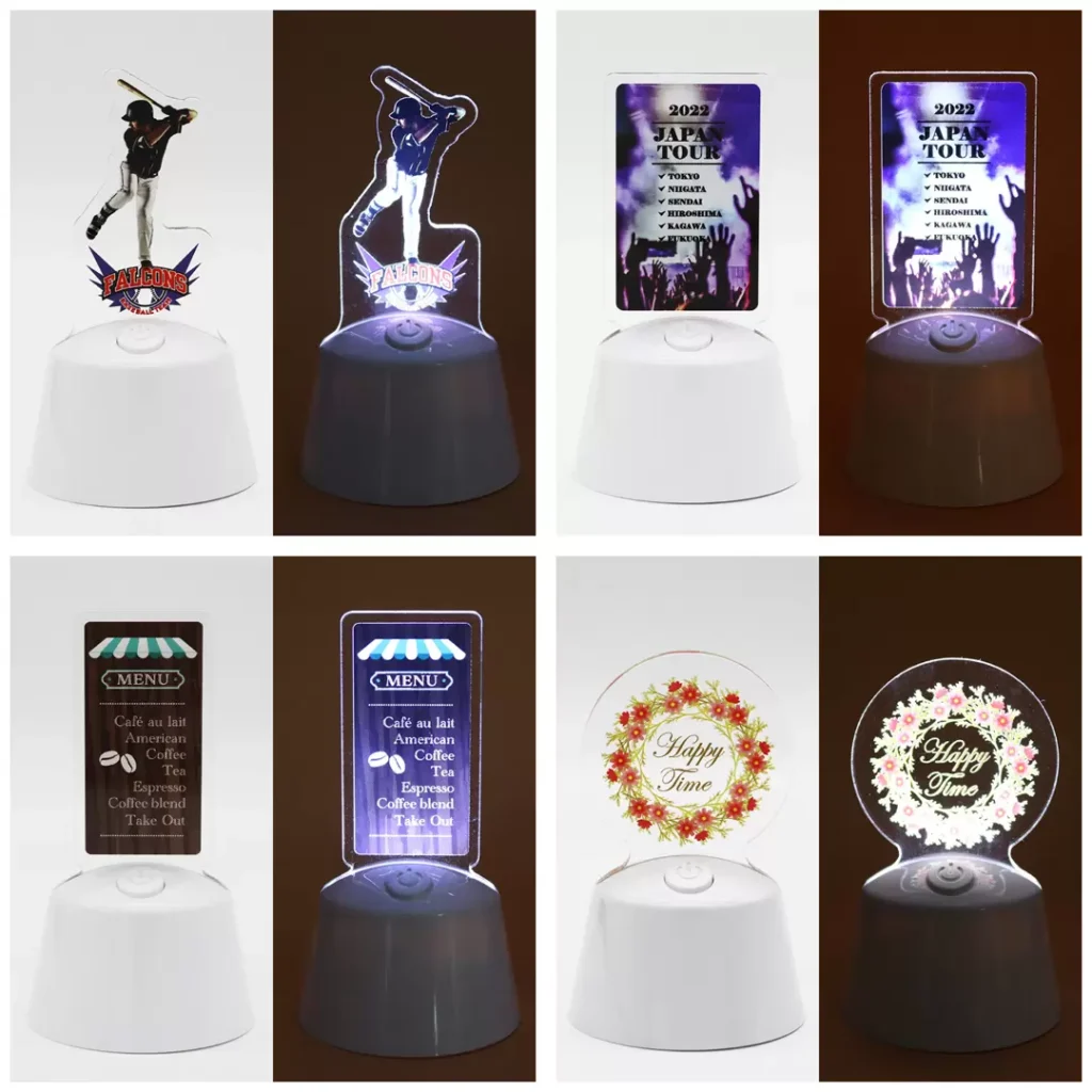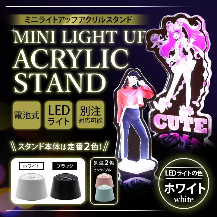 オリジナル ミニ ライトアップアクリルスタンドは、人気のアクリルスタンドにLEDライトを搭載した新しいアイテムです。コンパクトながらライトアップでデザインを美しく演出し、ライブグッズやイベント限定品に最適です。