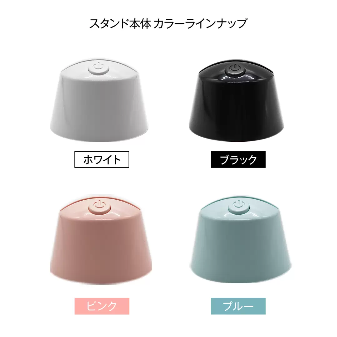 スタンド本体はホワイト・ブラックに加え、別注でピンク・ブルーにも対応。アクリル部分は自由な形状にカット可能で、キャラクターやロゴデザインを際立たせます。