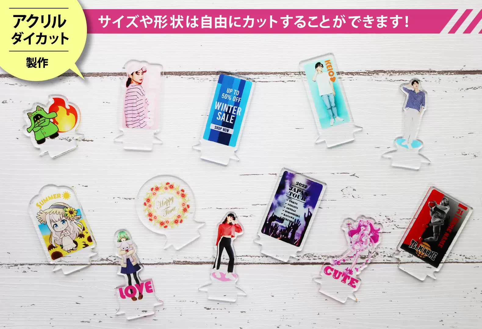 高品質なオリジナル アクリルスタンド(アクスタ)を、お客様のデザインで自由に制作していただけます。使用するのは透明度の高いアクリル素材。キャラクターやイラスト、写真などをフルカラーで高精細に印刷し、鮮やかで美しい仕上がりを実現します。印刷後にはダイカット加工を行い、自由な形にカットできるため、キャラクターの全身姿をそのまま立体的に再現したり、オリジナルのシルエットを生かした個性的なデザインに仕上げたりすることが可能です。 台座部分にもデザインをプリントできるのも大きな特長です。キャラクター名やグループロゴ、イベント名、サークル名などを入れることで、グッズ全体に統一感を持たせたり、推し活に欠かせない「推しだけのアイテム」を演出することができます。ライブグッズやコンサート、アニメイベント、同人サークルでの販売など、幅広いシーンで活躍するオリジナルグッズとしてご利用いただけます。 また、小型サイズのアクリルスタンドも制作可能です。カプセルトイの景品やコレクションアイテムとしても人気で、ファンが気軽に集めたくなる商品に仕上げられます。 販売に必要な資材も一式揃っておりますので、お客様にはデザインデータをご入稿いただくだけで、完成品としてすぐに販売が可能です。国内生産で、小ロットから大ロットまで柔軟に対応いたしますので、初めての方や少量から試したい方にも安心です。ぜひお気軽にご相談ください。