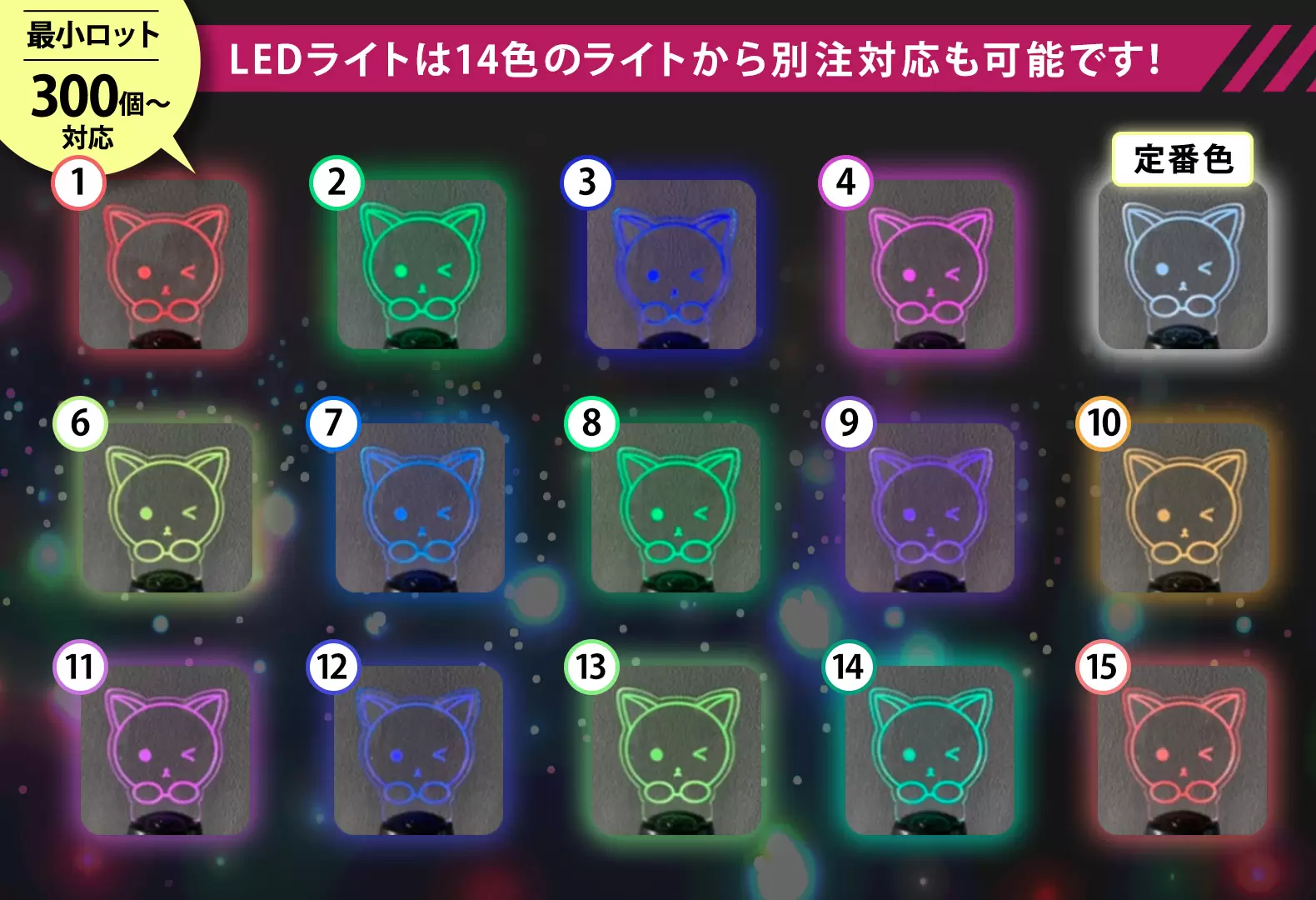 ライト部分にはホワイトLEDを標準採用しており、シンプルなデザインからカラフルなデザインまで美しく浮かび上がらせることが可能です。さらに300個以上のご注文からは別注カラーにも対応でき、メンバーカラーやチームカラーを活かしたオリジナルグッズ制作にも最適です。