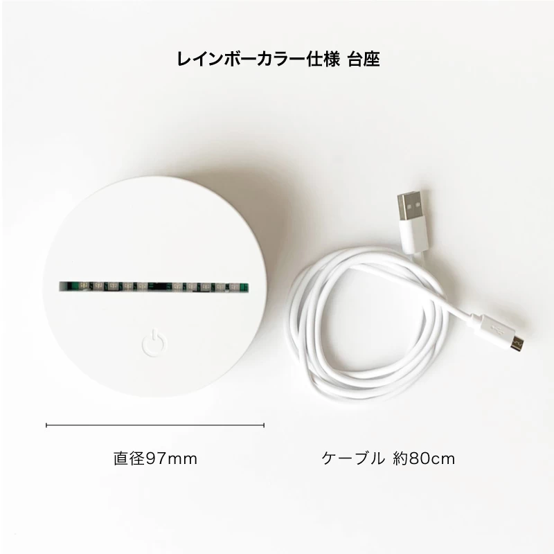 オリジナル ライトアップアクリルスタンドは、電球色タイプは電源スイッチの付いたUSBケーブルが台座に一続きになっており、ケーブルのスイッチでON・OFFの切り替えが可能ですので、インテリアとしてベッドサイドなどに設置するのにもおすすめです。また、レインボーカラーは、付属のUSBケーブルで電源を取る形となります。こちらは本体でON・OFFなどの操作が可能になっています。