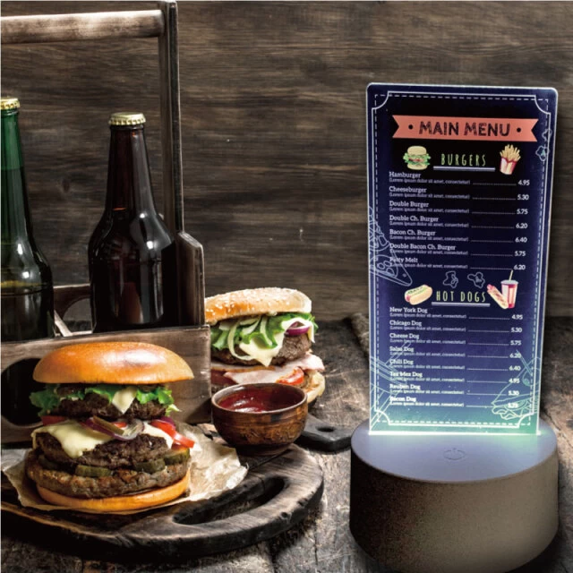 採用されているライトはLEDのため、熱くならず安全に使用できる点も特長です。火傷や火事のリスクが低く、場所を選ばず設置できるので、飲食店のテーブルに置くメニュー表としても活用可能です。光るアクリルスタンドは、店内の雰囲気づくりや商品の訴求効果にも役立ちます。