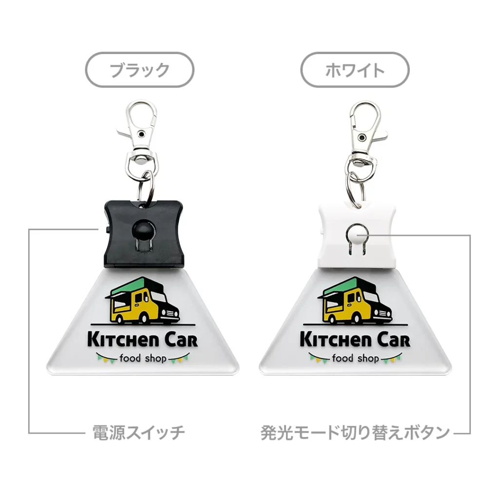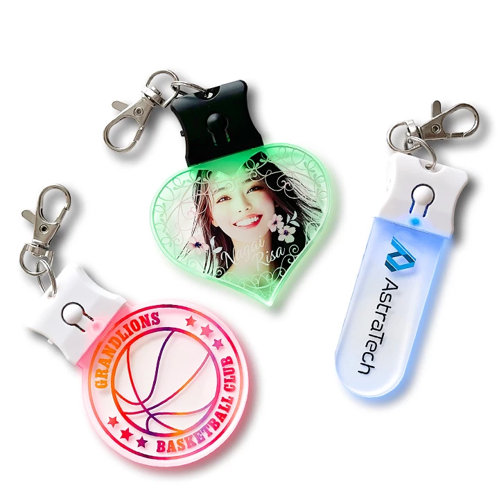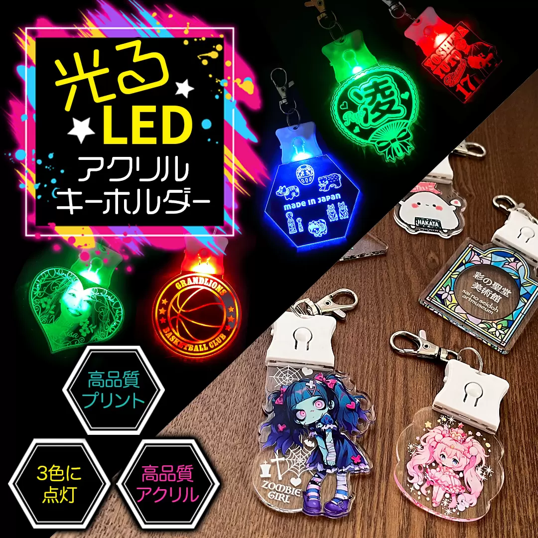 高透明度のアクリル素材にオリジナルデザインをプリントし、デザインに沿って美しくカット。さらに、3色に発光するLEDライトを内蔵した「光るアクリルキーホルダー」です。暗い場所でも鮮やかに光り、デザインを一層引き立てます。