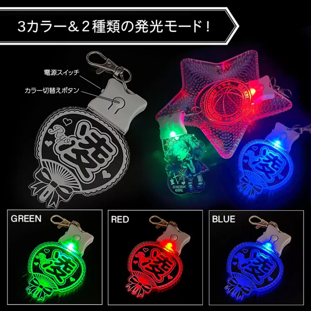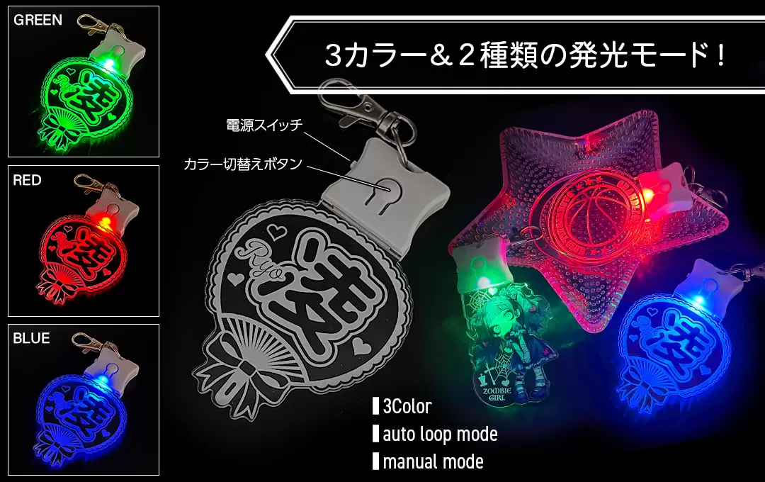 LEDライトはボタン操作で色を切り替えられ、ライブや夜間イベントで注目を集めること間違いなし。推し活グッズとして夜のライブ会場やイベントで光らせれば、ファン同士の一体感を演出できます。また、キーライトやペットのお散歩ライトとしても実用的で、日常生活でも活躍します。