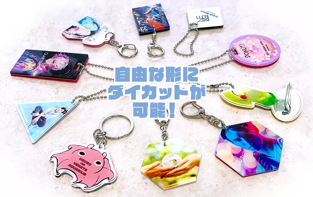 UVインクジェットによる繊細で美しいプリントを、透明度の高いクリアアクリル「全面」に施しますので、非常に高級感のある仕上がりとなります。また、形状やサイズはお客様のデザインに合わせてダイカット加工で自由な形状に切り出すことができますので、簡単にオリジナリティ溢れるグッズを制作することができます。