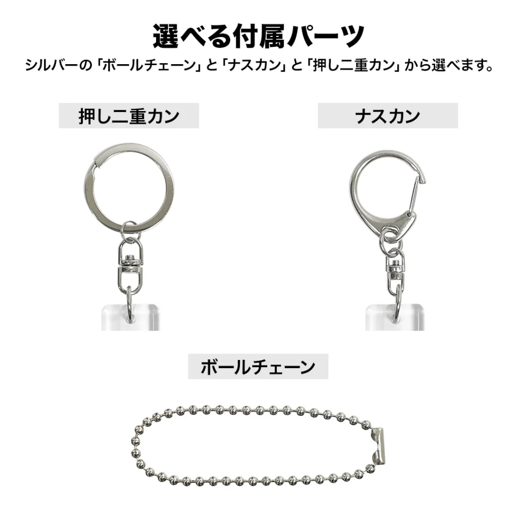 オリジナル 貼り合わせ 両面アクリルキーホルダーは、デザインや使用目的に合わせて「ボールチェーン(シルバー)」「ナスカン」「押二重カン」の3種類からお選びいただけます。また、オプション仕様になりますが「カラーボールチェーン」や「カラーワイヤーリング」に変更も可能です。それぞれ7カラーずつバリエーションがございますので、デザインの幅がグッと広がります。