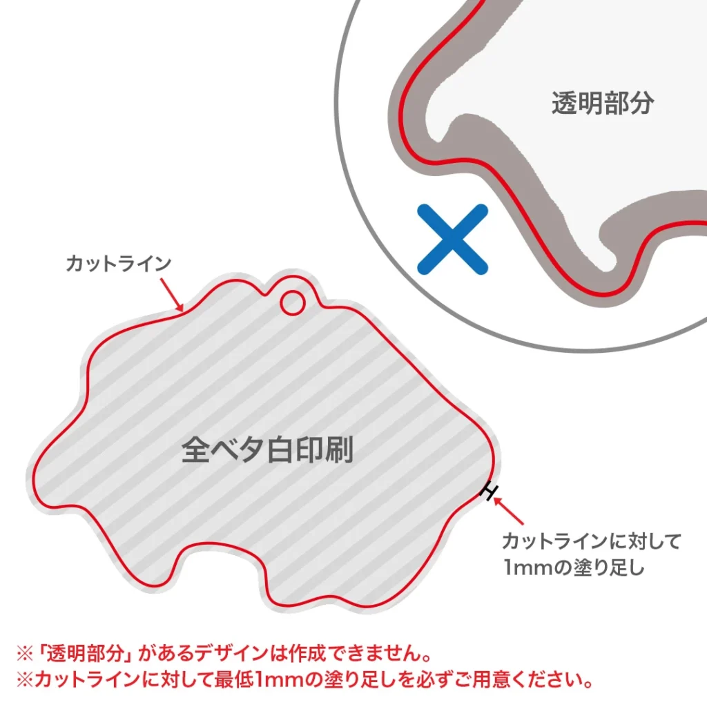 UVインクジェットによる繊細で美しいプリントを、透明度の高いクリアアクリル「全面」に施しますので、非常に高級感のある仕上がりとなります。また、形状やサイズはお客様のデザインに合わせてダイカット加工で自由な形状に切り出すことができますので、簡単にオリジナリティ溢れるグッズを制作することができます。