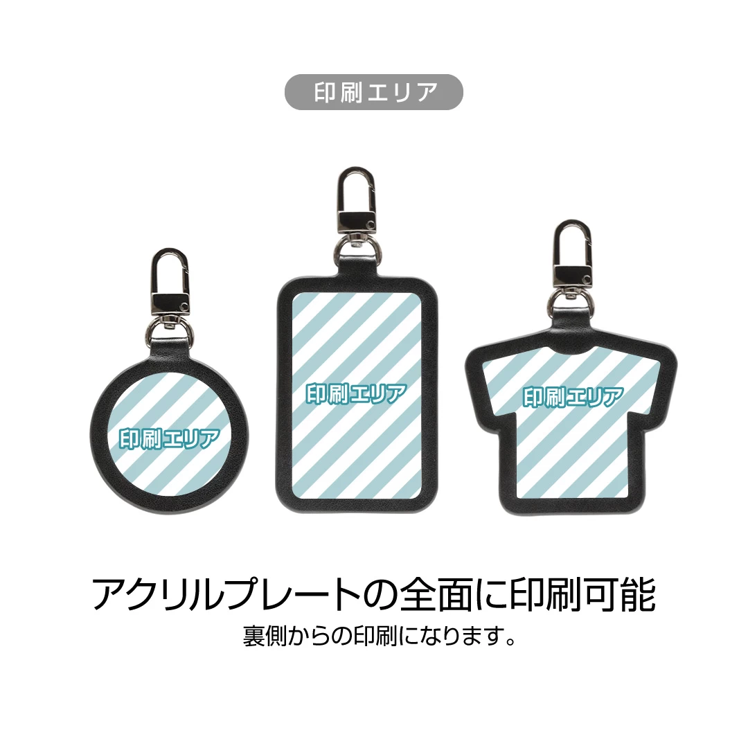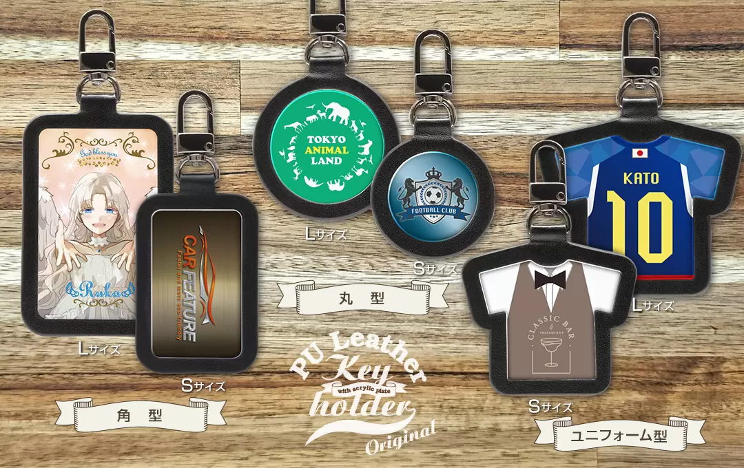 オリジナルデザインのPUレザーキーホルダー(アクリルプレート仕様)を小ロットから制作可能です。丸型・角型・ユニフォーム型の3種6タイプから形状が選べ、透明度の高いアクリルに裏刷り印刷を施すことで、立体感のある高級感あふれる仕上がりになります。