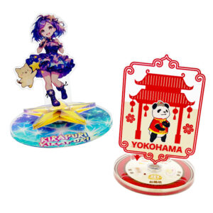 高品質なオリジナル アクリルスタンド(アクスタ)を、お客様のデザインで自由に制作していただけます。使用するのは透明度の高いアクリル素材。キャラクターやイラスト、写真などをフルカラーで高精細に印刷し、鮮やかで美しい仕上がりを実現します。印刷後にはダイカット加工を行い、自由な形にカットできるため、キャラクターの全身姿をそのまま立体的に再現したり、オリジナルのシルエットを生かした個性的なデザインに仕上げたりすることが可能です。 台座部分にもデザインをプリントできるのも大きな特長です。キャラクター名やグループロゴ、イベント名、サークル名などを入れることで、グッズ全体に統一感を持たせたり、推し活に欠かせない「推しだけのアイテム」を演出することができます。ライブグッズやコンサート、アニメイベント、同人サークルでの販売など、幅広いシーンで活躍するオリジナルグッズとしてご利用いただけます。 また、小型サイズのアクリルスタンドも制作可能です。カプセルトイの景品やコレクションアイテムとしても人気で、ファンが気軽に集めたくなる商品に仕上げられます。 販売に必要な資材も一式揃っておりますので、お客様にはデザインデータをご入稿いただくだけで、完成品としてすぐに販売が可能です。国内生産で、小ロットから大ロットまで柔軟に対応いたしますので、初めての方や少量から試したい方にも安心です。ぜひお気軽にご相談ください。