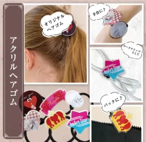 オリジナル アクリルヘアゴムは、透明度が高く美しい光沢を持つ高品質なクリアアクリルを使用し、お客様のデザインに合わせて自由な形で制作できるアイテムです。キャラクターやロゴ、イラストを鮮やかに再現できるため、アクセサリーとしての実用性に加え、オリジナルグッズならではの特別感を演出することができます。髪を束ねるヘアアクセサリーとしてはもちろん、手首にブレスレット感覚で身につけたり、コーディネートのワンポイントに取り入れたりと、日常のさまざまなシーンで活躍します。コンサートやライブの定番グッズとして、アニメやキャラクター作品のファングッズとして、さらには企業や店舗のノベルティやイベント景品としても喜ばれる、汎用性の高い商品です。 サイズや形状は用途やデザインに応じて自由にカスタマイズ可能で、アクリルならではの透明感とフルカラー印刷の鮮明さを組み合わせることで、世界観をしっかりと表現することができます。国内生産で小ロットから大ロットまで柔軟に対応しているため、初めてのオリジナルグッズ制作やテスト販売から、大規模な物販展開まで安心してご利用いただけます。販売に必要な資材も揃っているので、デザインをご入稿いただくだけで完成品として販売が可能です。 オリジナル アクリルヘアゴムは、実用性とデザイン性を兼ね備えたグッズとして、ファンやお客様に長く愛用していただけるアイテムです。